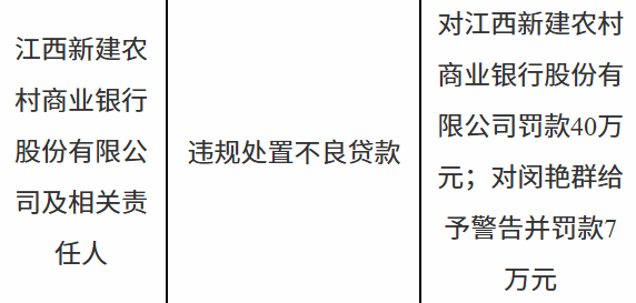1月23日,国家金融监督管理总局江西监管局行政处罚信息公开表显示,江西新建农村商业银行股份有限公司因违规处置不良贷款被罚款40万元。责任人闵某群被给予警告并罚款7万元。